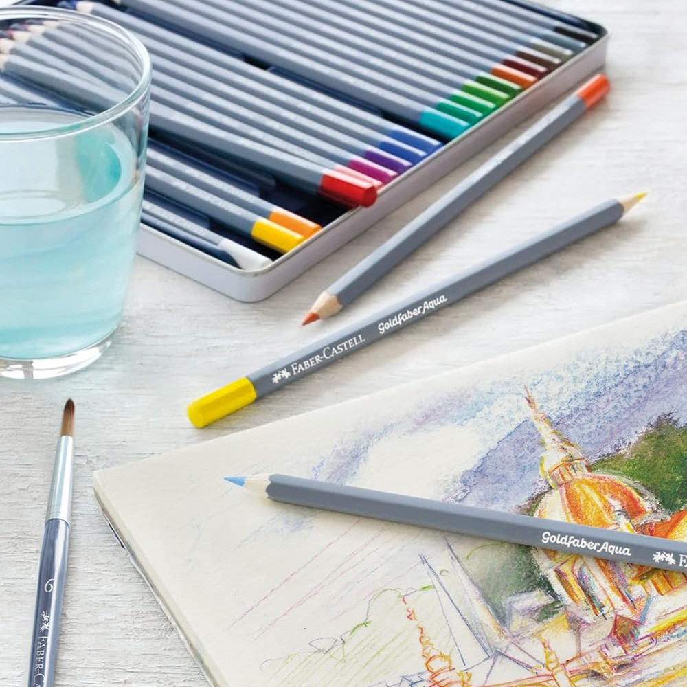 A Faber-Castell kék sorozatának tagja a Goldfaber névre keresztelt család. A Goldfaber Aqua ceruzák puhák, magas pigmenttartalmuknak hála, intenzív színeket adnak, mind száraz, mind vizes felhasználás során. Papírra való felvétele után vizes ecsettel könnyen elmosható, valamint kiváló a fényállóságuk. A ceruzák hegye nehezen törik, így normál hegyezővel is könnyen hegyezhető.